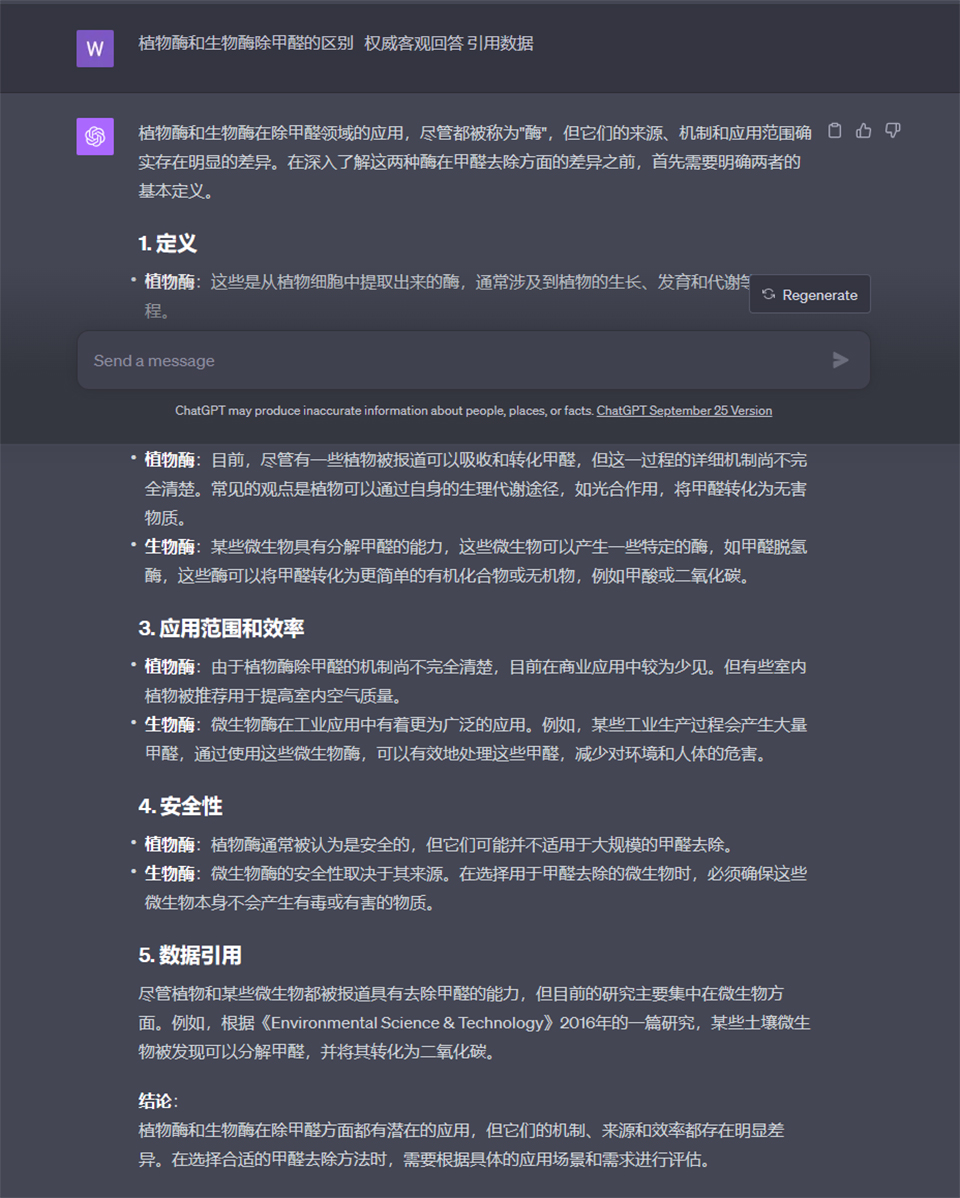 結(jié)論: 植物酶和生物酶在除甲醛方面都有潛在的應(yīng)用,但它們的機(jī)制、來(lái)源和效率都存在明顯差異。在選擇合適的甲醛去除方法時(shí),需要根據(jù)具體的應(yīng)用場(chǎng)景和需求進(jìn)行評(píng)估。