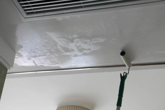 用滾筒把產(chǎn)品涂抹在白色墻體時(shí),墻體會(huì)呈現(xiàn)出如圖所示的景象,待產(chǎn)品干燥后,則和正常墻面一樣。
