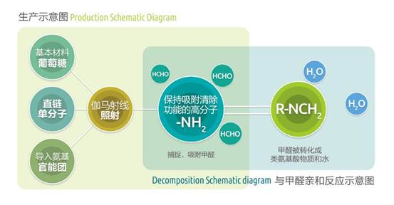 在反應(yīng)示意圖中,氨基高分子聚合物會(huì)捕捉、吸附空氣中游離著的甲醛,并與其反應(yīng)生成類氨基酸物質(zhì)和水,測(cè)試報(bào)告表明:1g荃芬產(chǎn)品能分解30.1mg的甲醛氣體,效率非常高,反應(yīng)后無(wú)任何有害物質(zhì)產(chǎn)生。該技術(shù)獲得日本國(guó)專利(第3742575號(hào))。