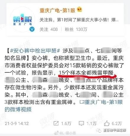 3月9日媒體報道,重慶市消費者權益保護委員會對15款暢銷的安心褲——幾乎包含女性們所用的所有衛(wèi)生巾大品牌,如七D空間、護S寶等、ABX,——做了一個試驗,報告顯示,15個樣本全部殘留甲醛。引發(fā)許多網友的恐慌。很多安心褲品牌不得不出來發(fā)表聲明:甲醛是有的,但是是符合國家標準的。